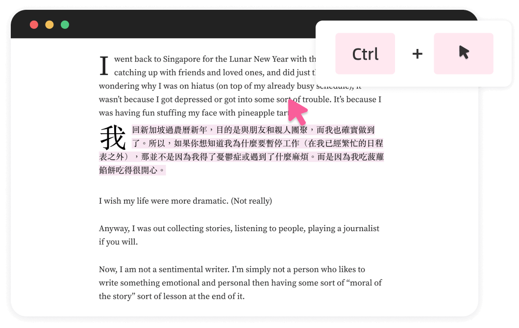 僅需將滑鼠停留在任意網頁的任意段落上,同時按下預設的快捷鍵(如Ctrl),相應的譯文就會立即出現在段落下方。段落在【沉浸式翻譯】的設計理念中被視為最小單位,保留其上下文,這樣我們才能真正理解並學習外語。