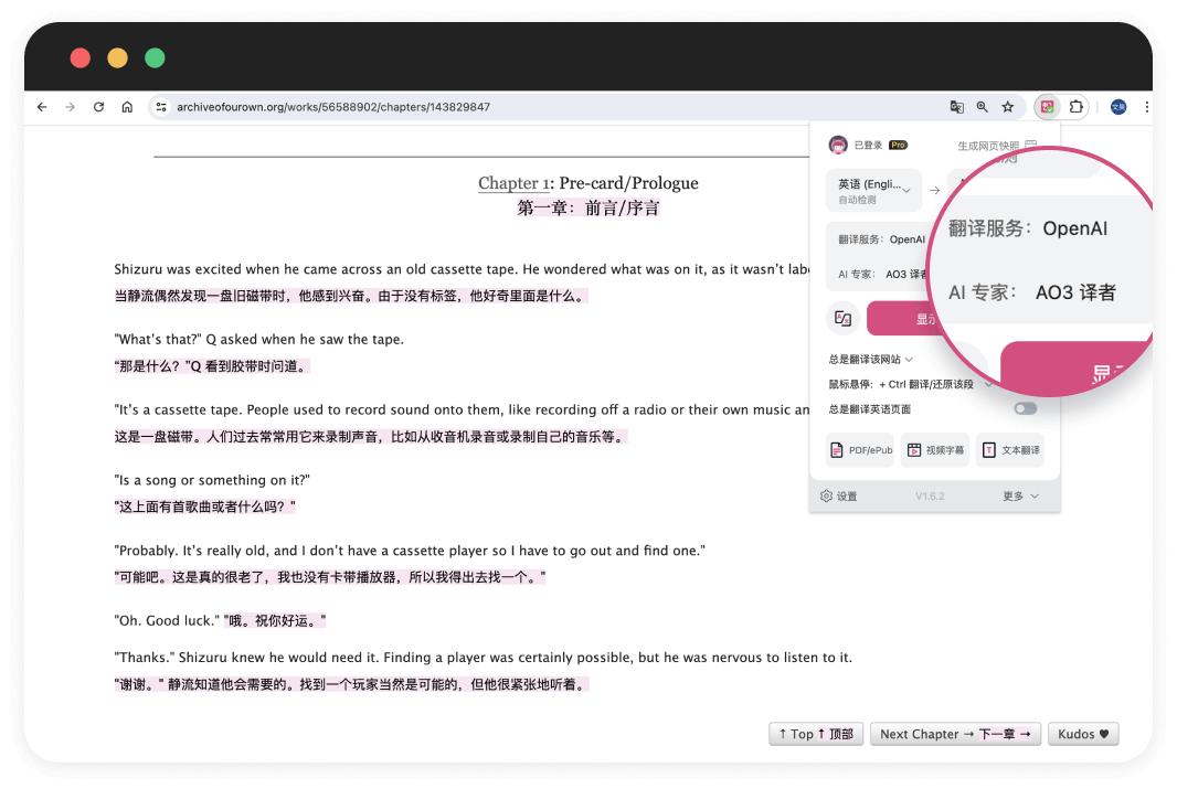 AO3一鍵變雙語對照,超讚看文神器:沉浸式翻譯